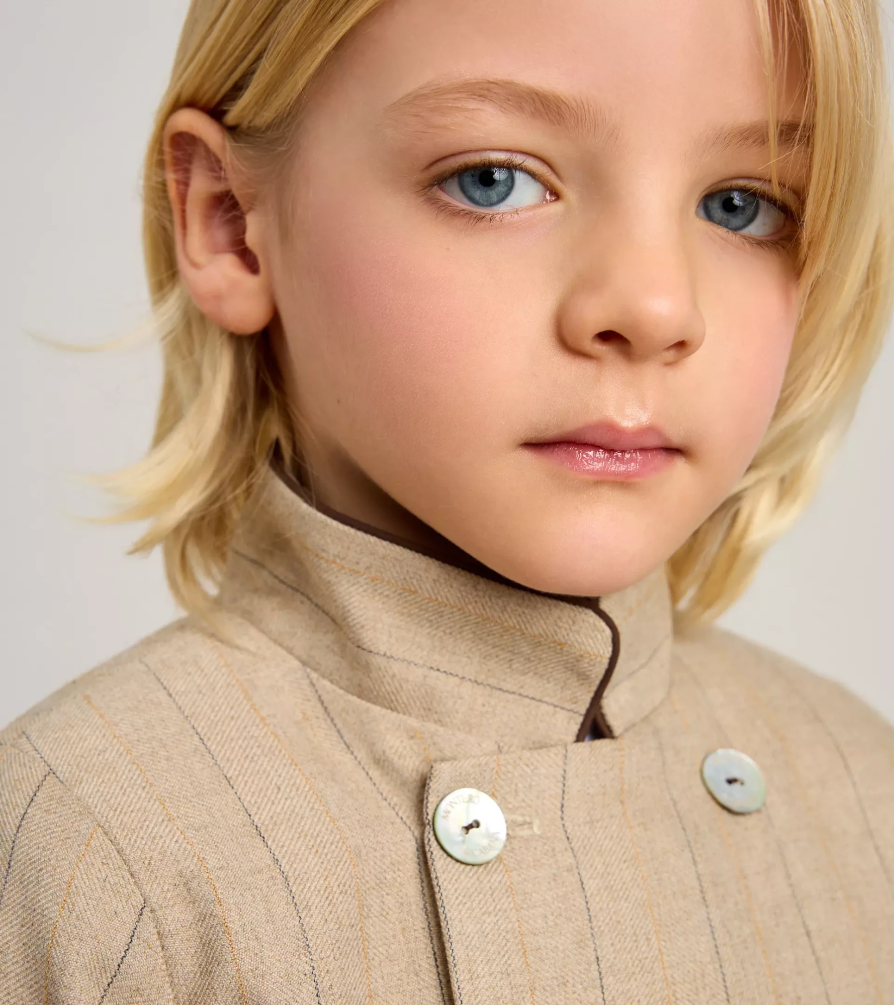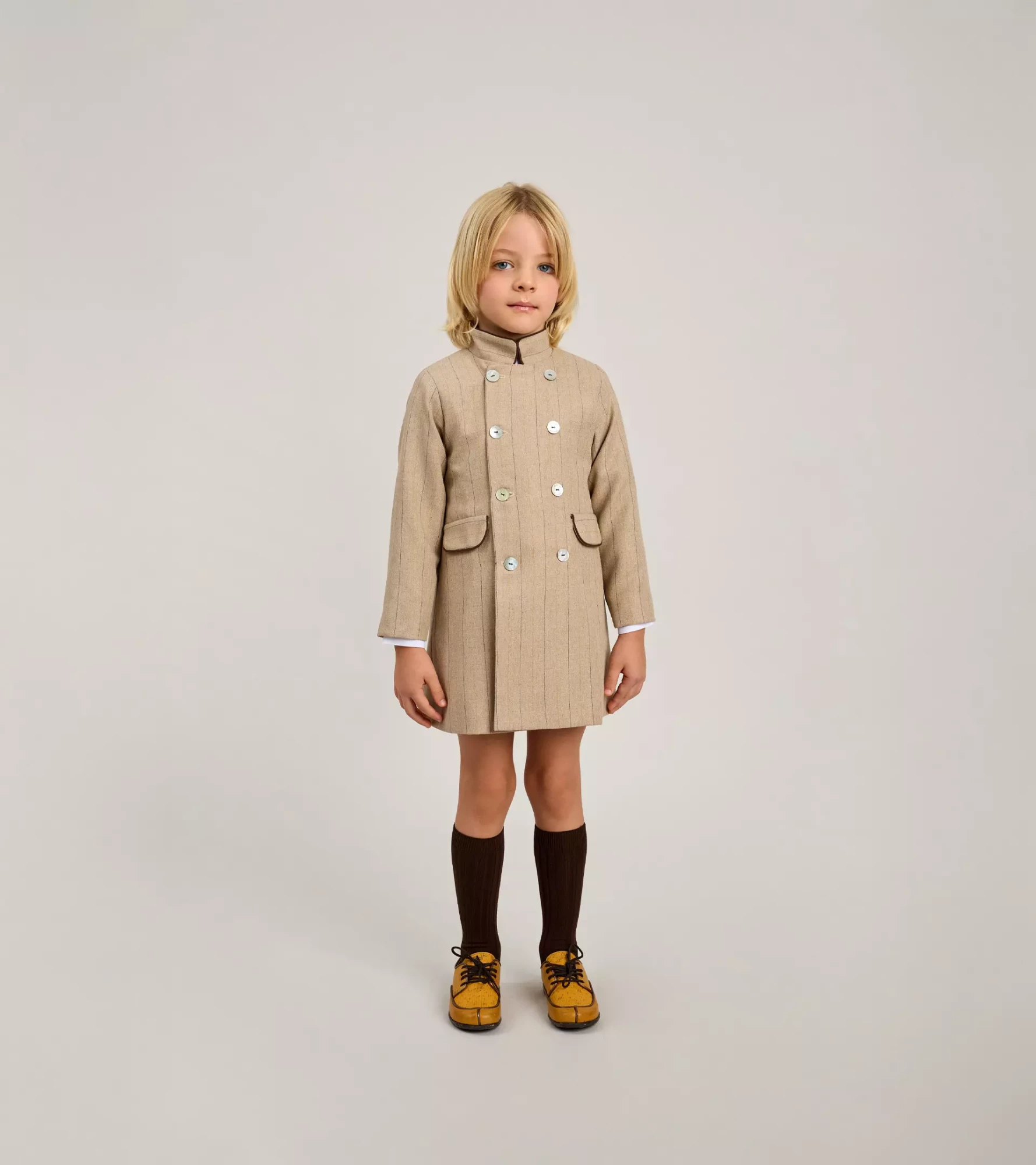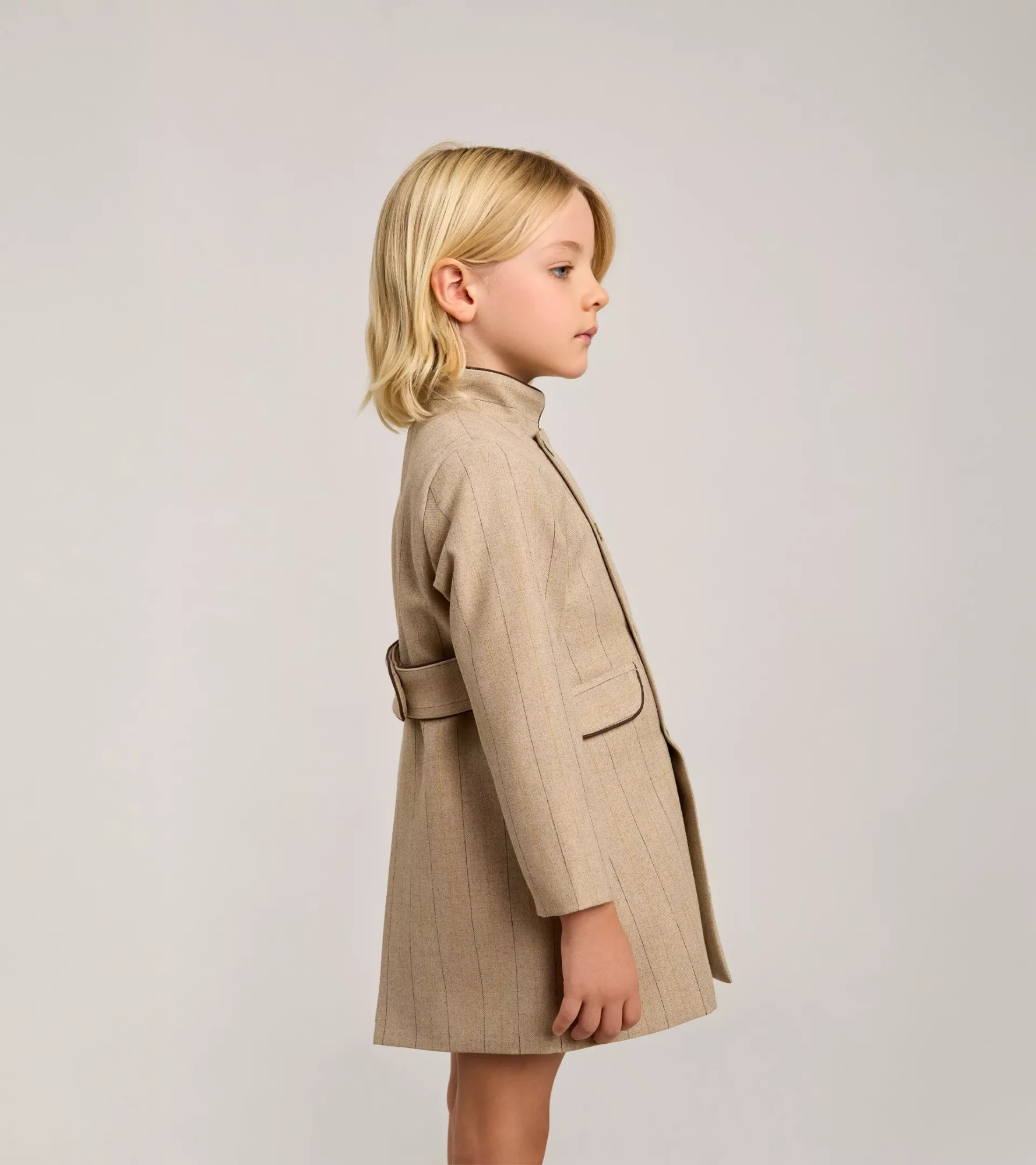 Abrigo de niño, en tejido de espiga y rayas, en color topo. Corte clásico , con doble abotonadura, cuello de tirilla, mangas sastre, adorno de bolsillos, cinturón en la cintura espalda. Botones con el nombre de la marca. Forro interior con acabados de vivos en rayas.