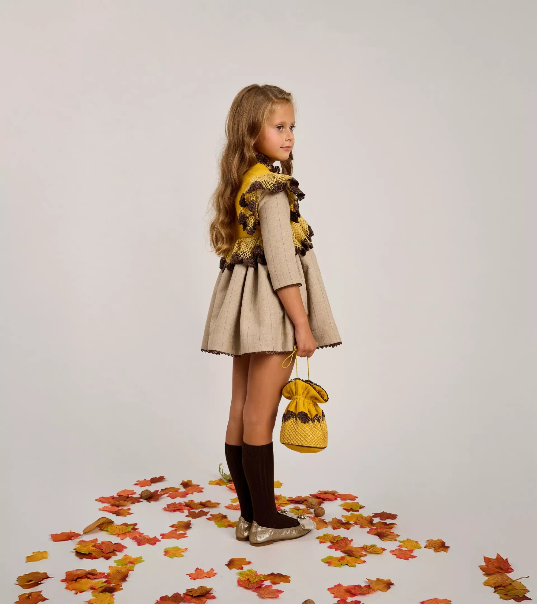 Bombonera en algodón orgánico de color mostaza y adornos de lana en color marrón. Base rígida, goma en la parte superior y cordón para colgar de color mostaza.