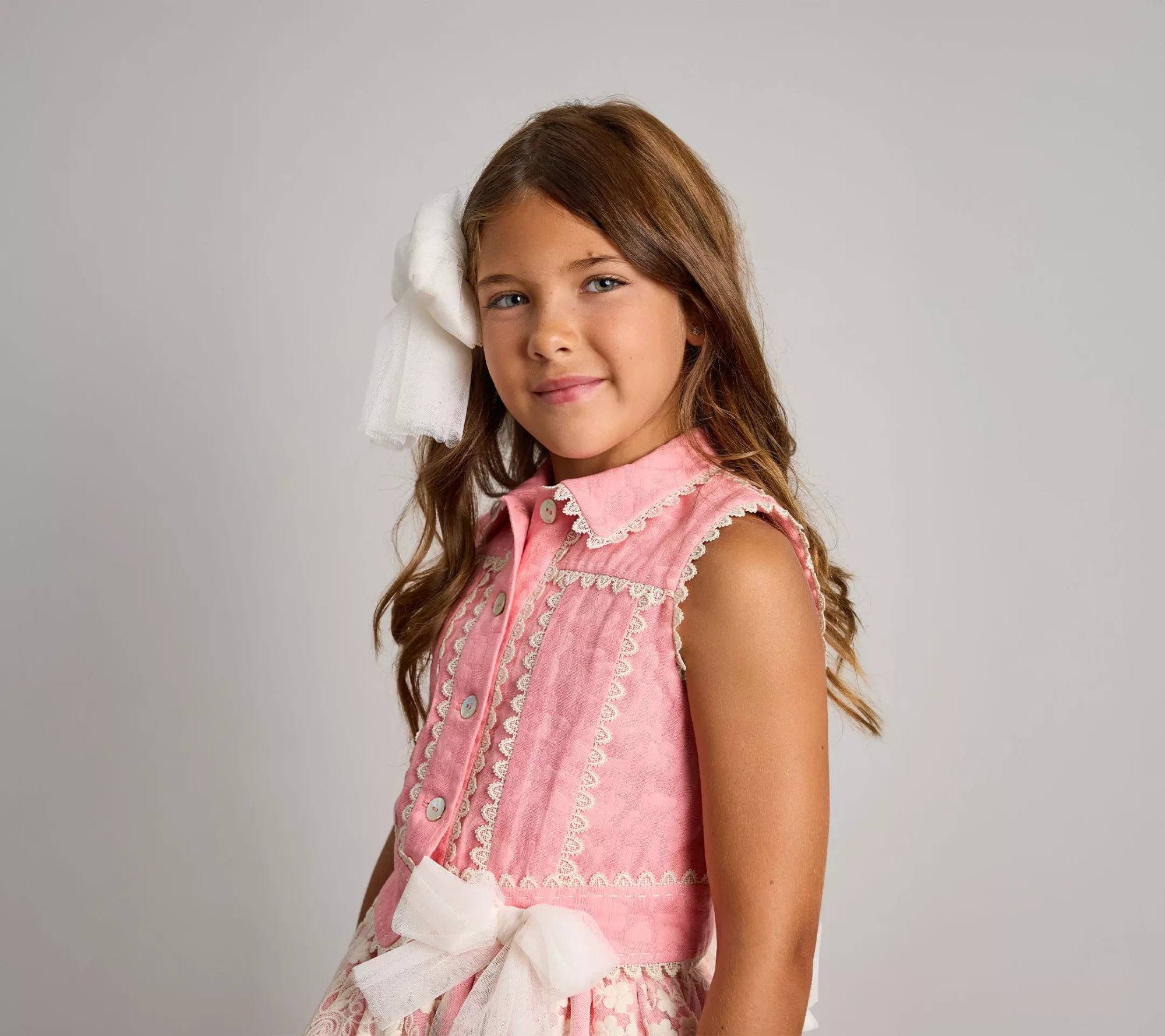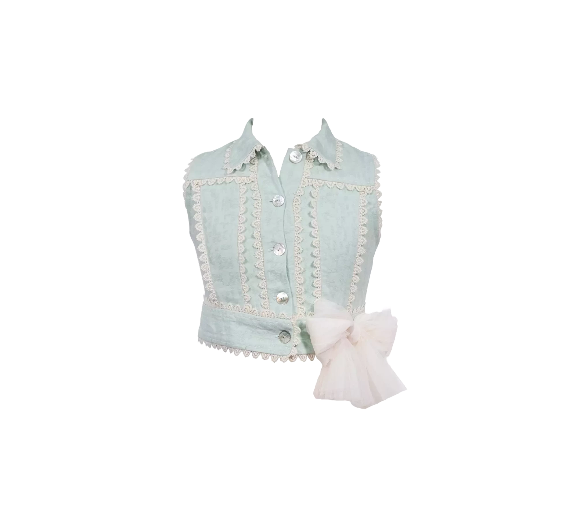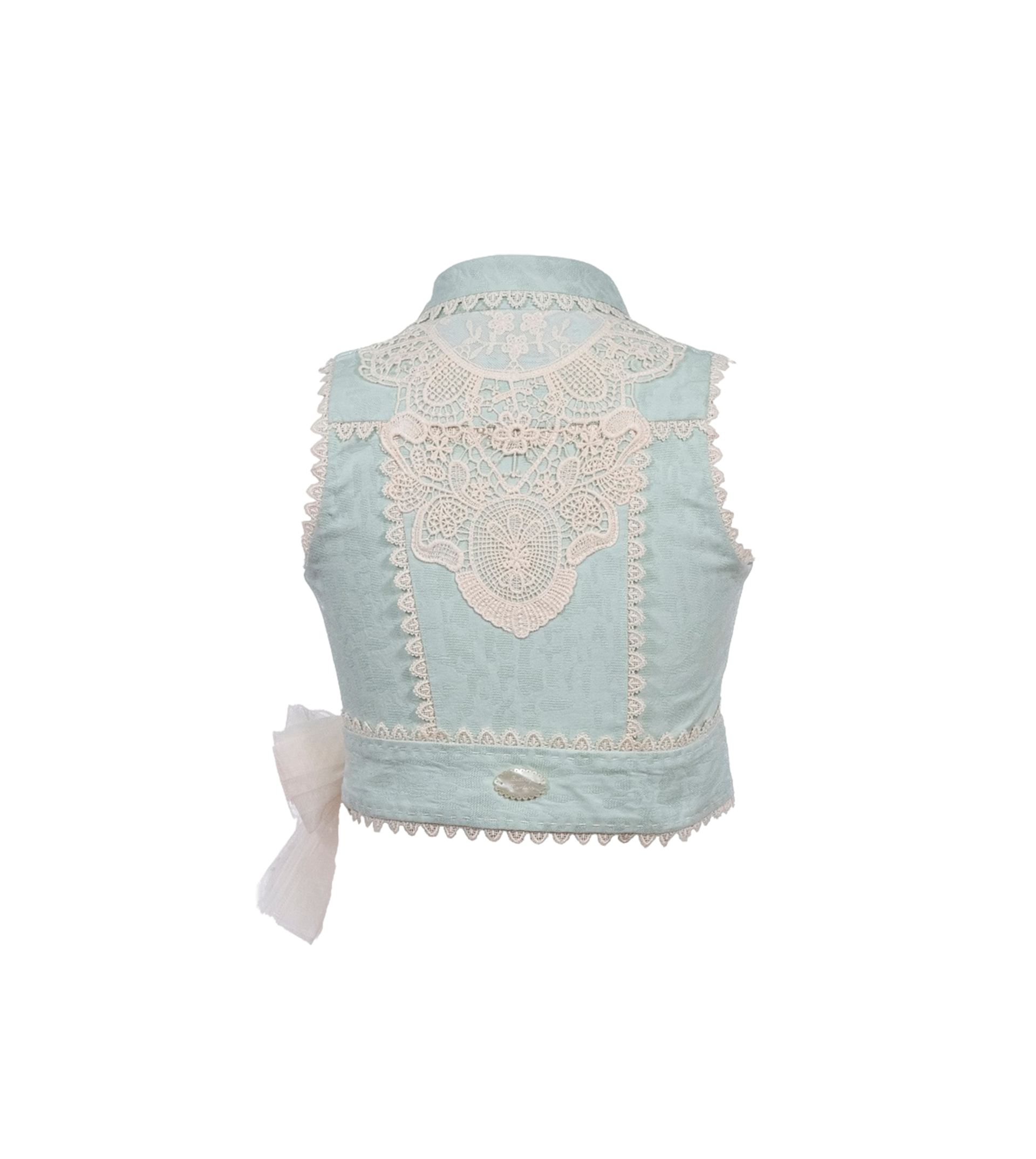 Camisa en tejido de jacquard, mangas a la sisa, con cortes en delanteros y espalda, abertura delantera con botones y gran aplique de guipur en espalda.