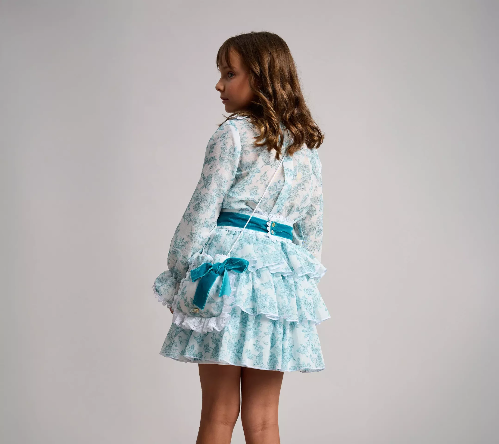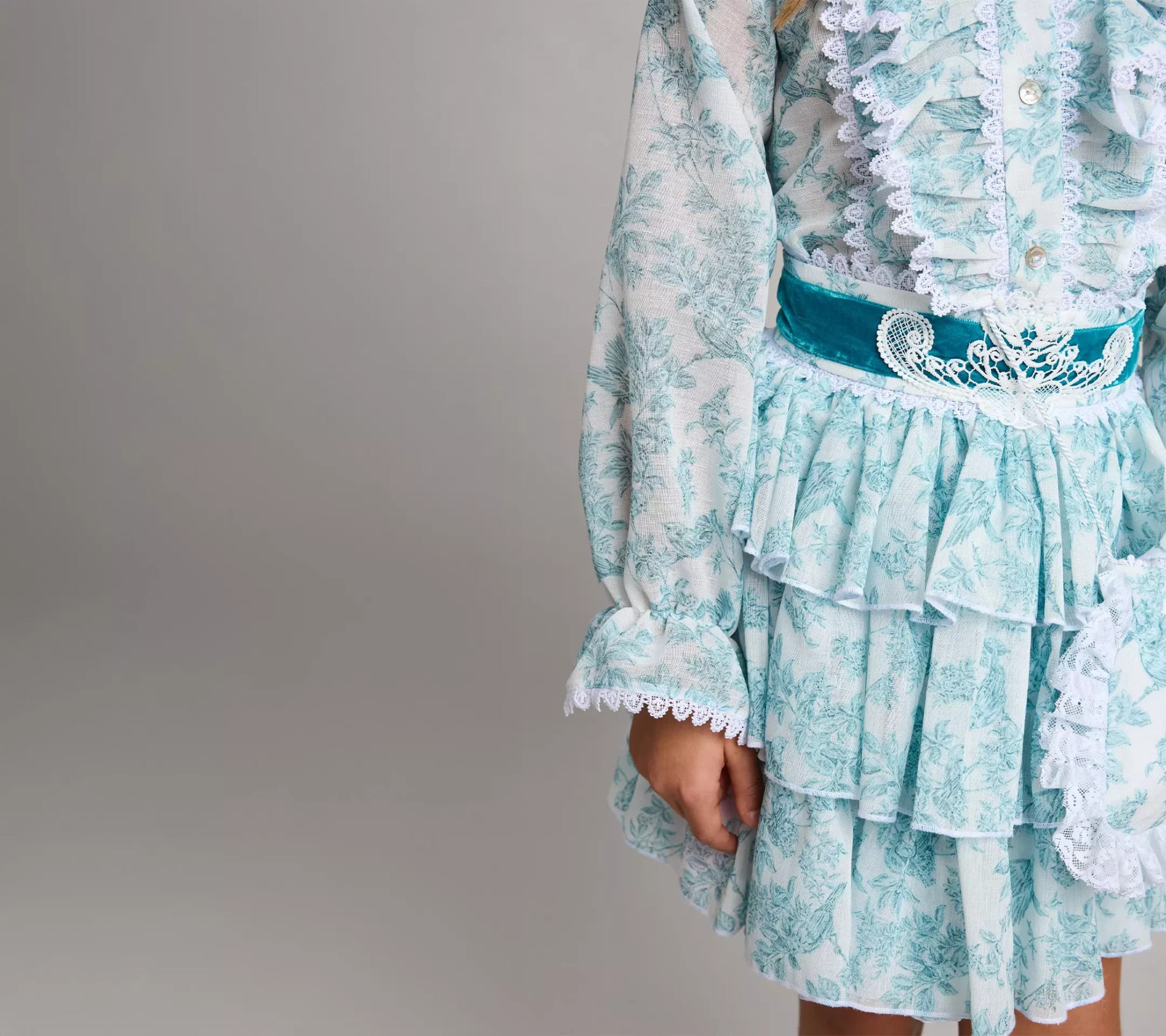 Camisa camisera con volantes en tejido de hilo estampado, con abertura delantera y mangas de vuelo acabada en volante con goma.