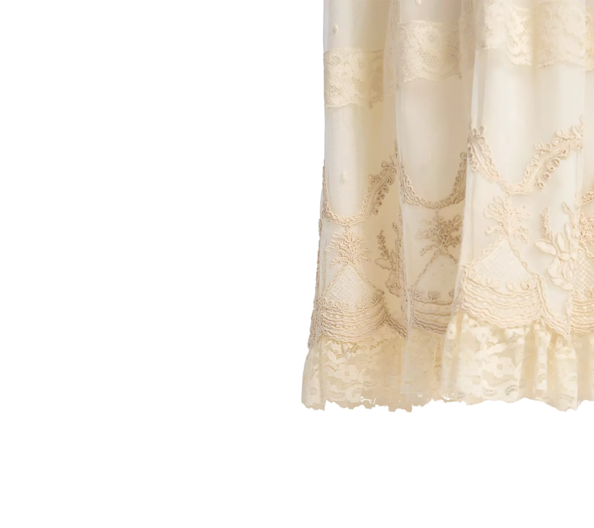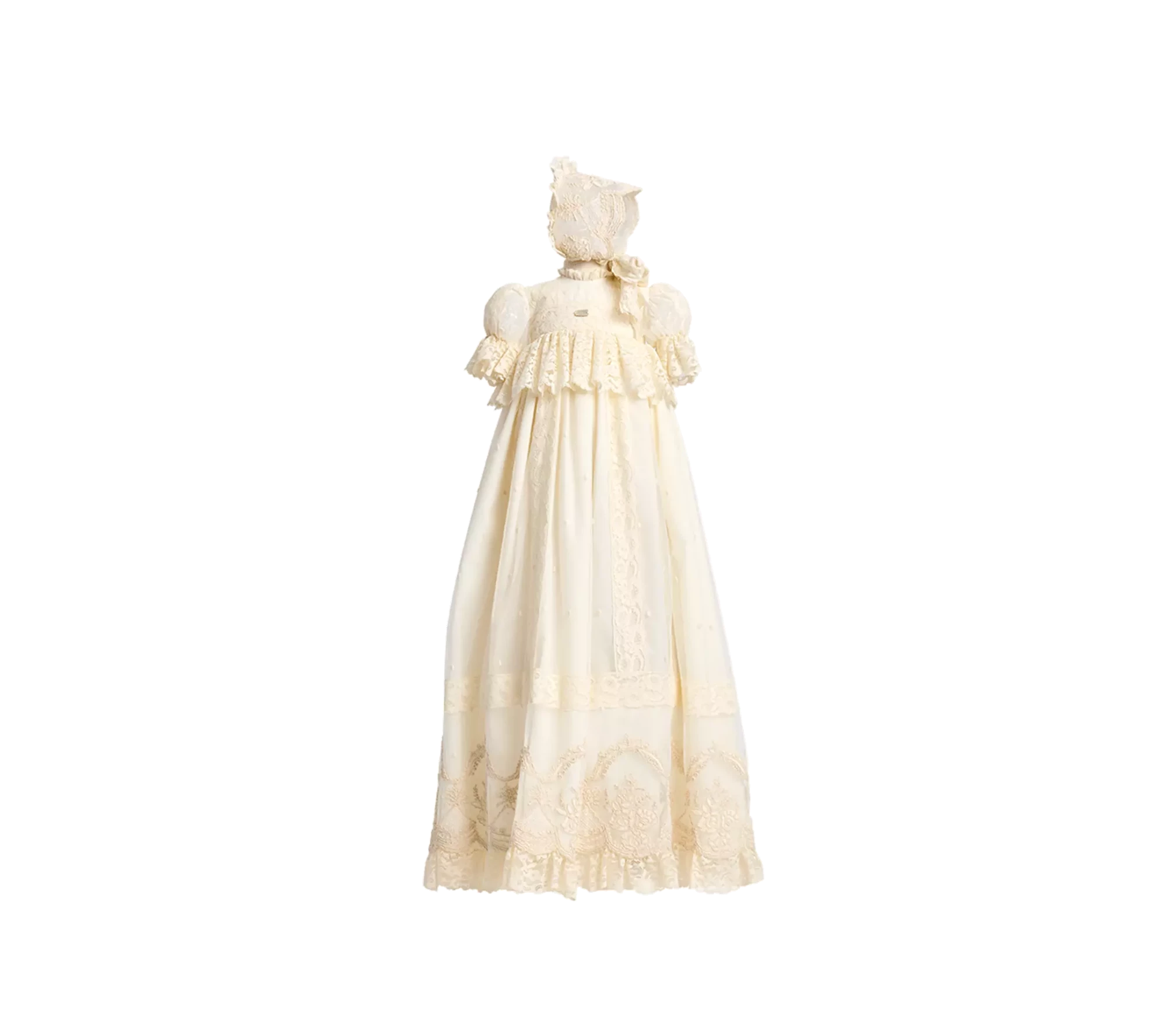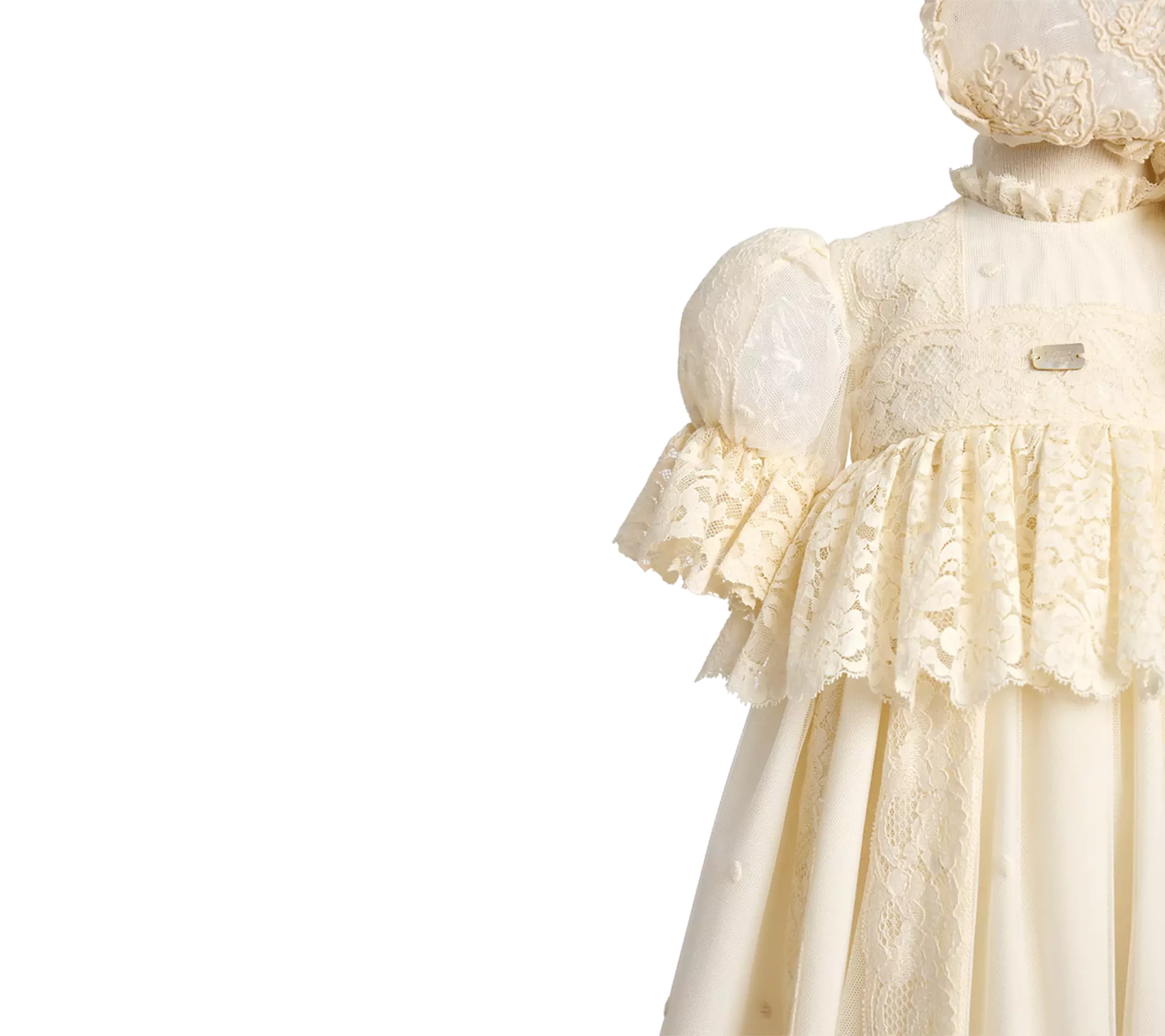Fabricado en tul bordado, cuerpo adornado con tiras bordadas, volantes de alençon, encajes de valencie, bajo grabado y acabado en volantes de alençon.
