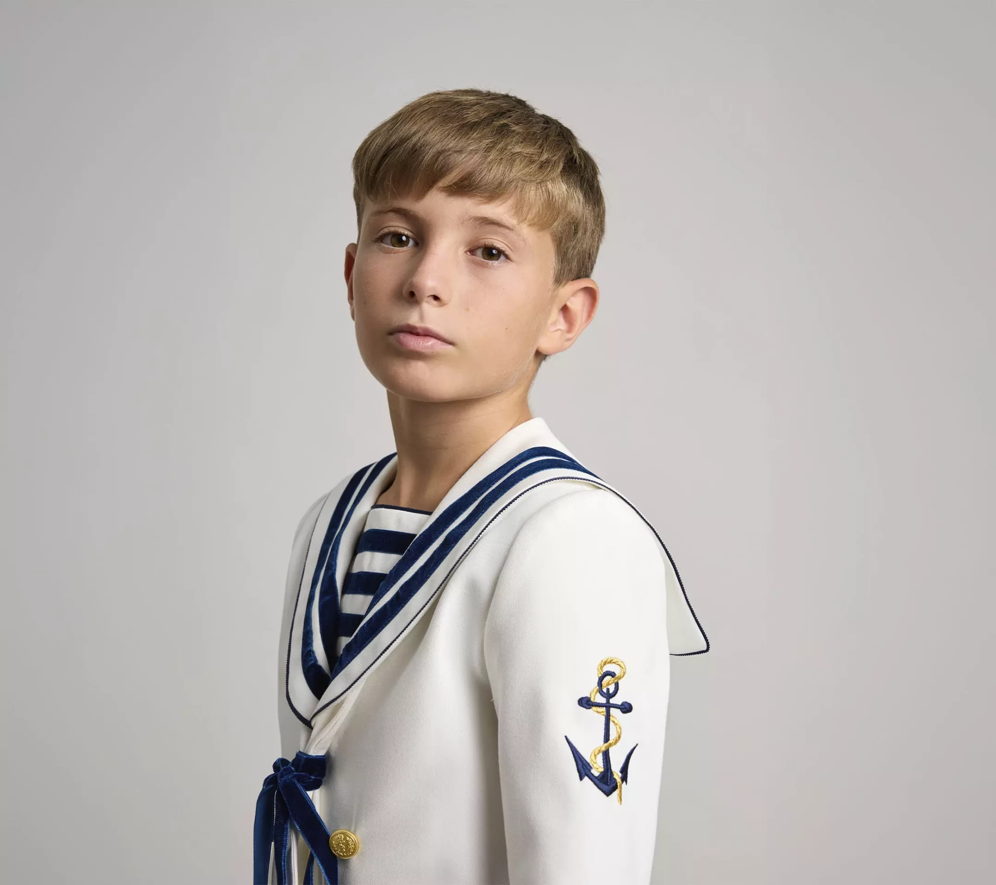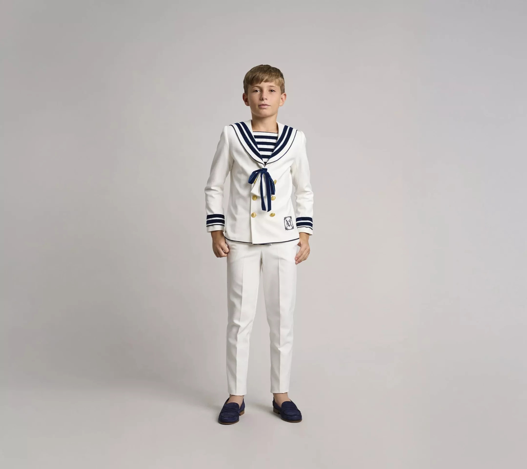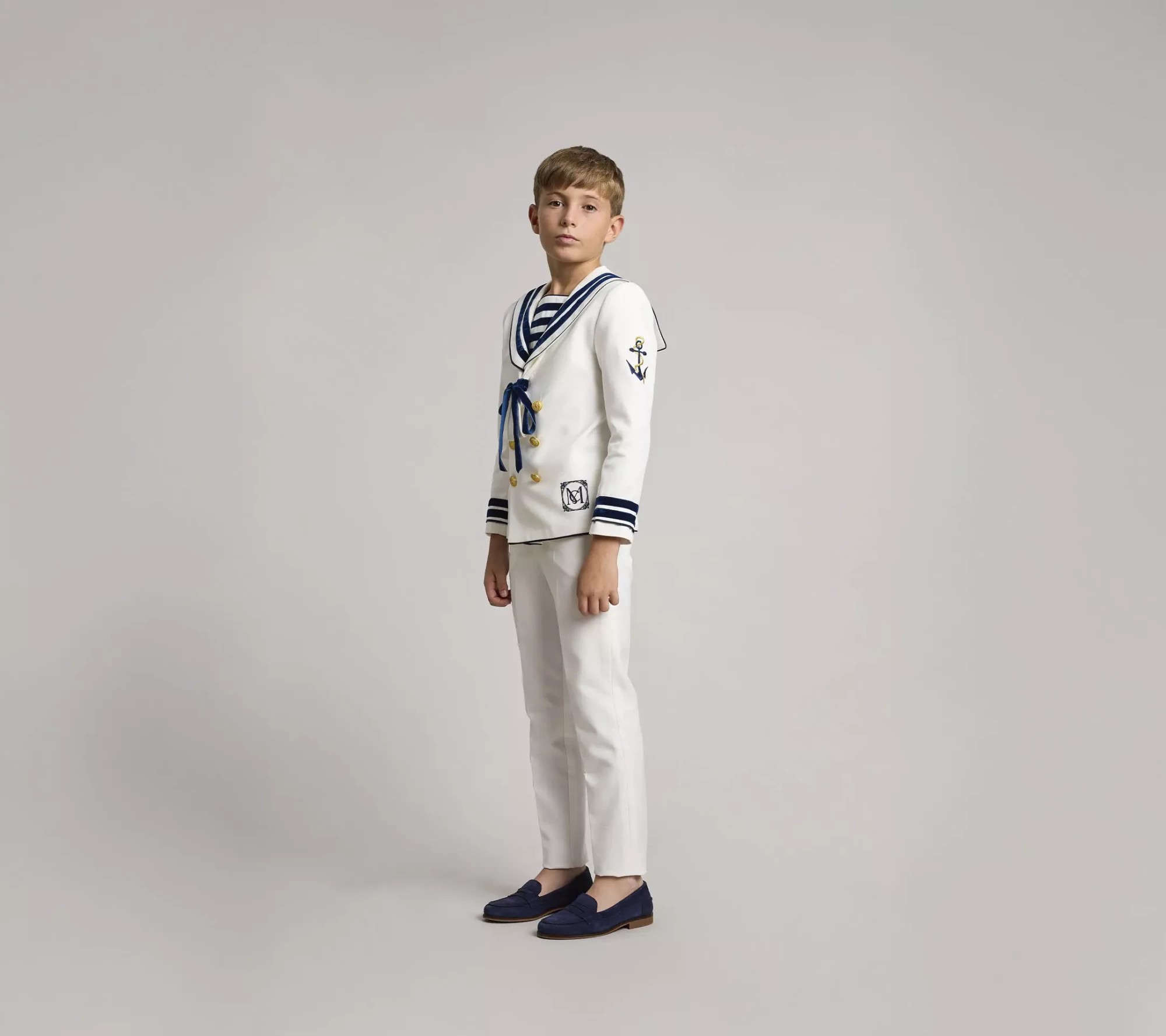 Traje de comunión con doble abotonadura, en tejido de sarga natural, con adornos de cinta de terciopelo azul marino en cuello, mangas y pecherín. En la manga izquierda tiene un bordado de un ancla en azul marino con cuerda dorada y logo de la marca en el delantero. Lazo de terciopelo anudando el corbatín. Pantalón largo de piernas estrechas, con goma en la cintura espalda para dar ajuste y comodidad. Bolsillos laterales.